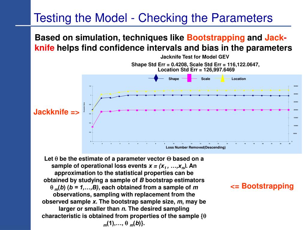 Jacknife Test for Model GEV Shape Std Err = 0.4208, Scale Std Err = 116,122.0647, Location Std Err = 126,997.6469 Shape Scale Location 1.2 350000 300000 1 250000 0.8 Parameter Value 200000 0.6 150000 0.4 100000 0.2 50000 0 0 1 2 3 4 5 6 7 8 9 10 11 12 13 14 15 16 17 18 19 20 21 22 23 Loss Number Removed(Descending) Testing the Model - Checking the Parameters Based on simulation, techniques like Bootstrapping and Jack-knife helps find confidence intervals and bias in the parameters Jackknife => Let be the estimate of a parameter vector based on a sample of operational loss events x = (x1 , …,xn). An approximation to the statistical properties can be obtained by studying a sample of B bootstrap estimators m(b) (b = 1,…,B), each obtained from a sample of m observations, sampling with replacement from the observed sample x. The bootstrap sample size, m, may be larger or smaller than n. The desired sampling characteristic is obtained from properties of the sample {m(1),…, m(b)}. <= Bootstrapping