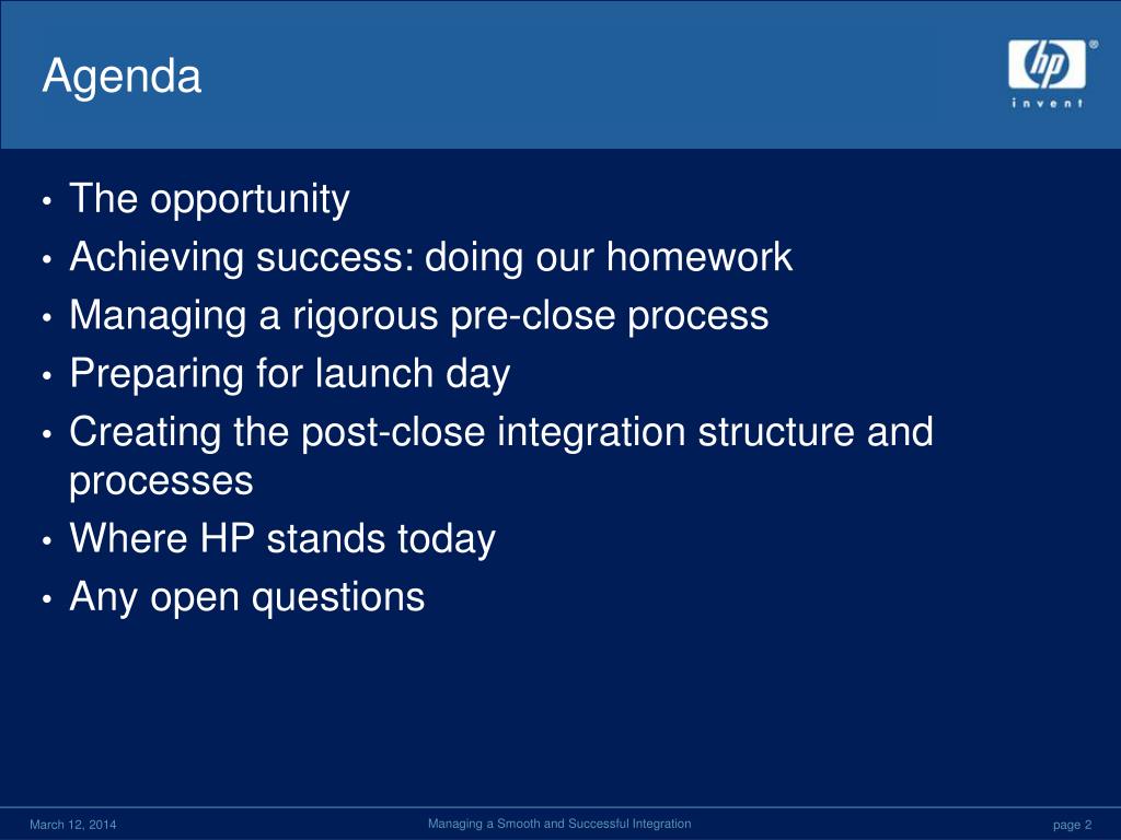 Agenda • The opportunity • Achieving success: doing our homework • Managing a rigorous pre-close process • Preparing for launch day • Creating the post-close integration structure and processes • Where HP stands today • Any open questions Managing a Smooth and Successful Integration