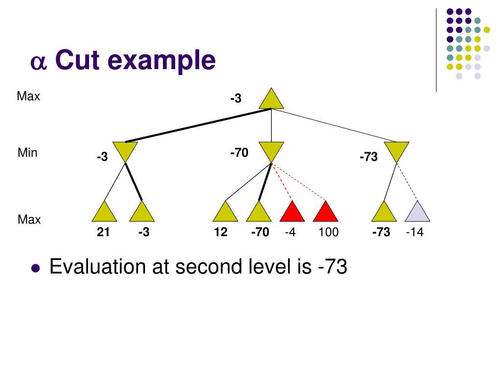 a Cut example Max -3 • Evaluation at second level is -73 Min -70 -3 -73 Max 21 -3 12 -70 -4 100 -73 -14