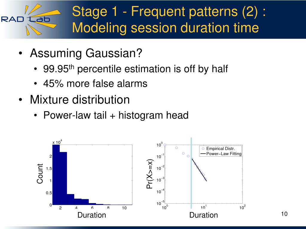 Stage 1 - Frequent patterns (2) : Modeling session duration time Count Pr(X>=x) • Assuming Gaussian? • 99.95th percentile estimation is off by half • 45% more false alarms • Mixture distribution • Power-law tail + histogram head Duration Duration
