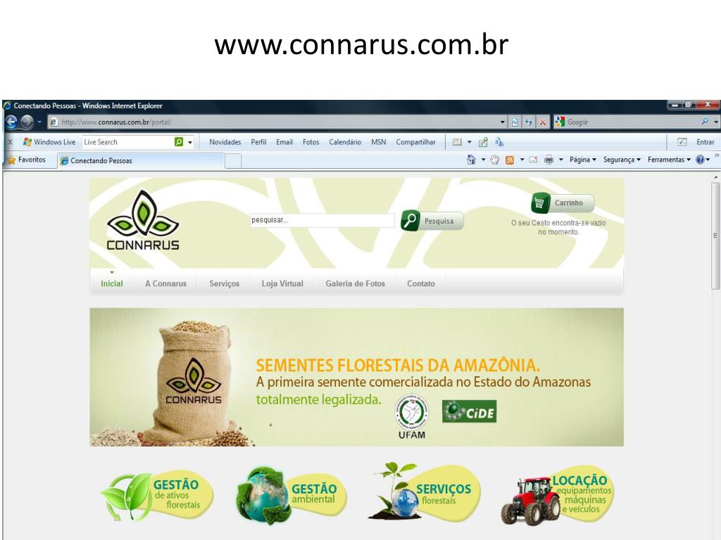 Parceria CONNARUS+UFAM+CIDE= Estruturação da cadeia produtiva no amazonas • ELABORAÇÃO DO SISTEMA DE INFORMAÇÕES • Mapeamento de árvores matrizes • Localização, Identificação Botânica, Cadastramento, Coleta de material fértil para análise • Produção • Implantação de ACS’s • Coleta • Beneficiamento • Transporte • Análise • Embalagem • Armazenamento • Comercialização • Portal www.connarus.com.br • Loja Virtual p/ comercialização dos produtos • Marketing digital • Planejamento Estratégico • Plano de negócios, Plano de marketing, Plano de Gestão, Estudo de mercado