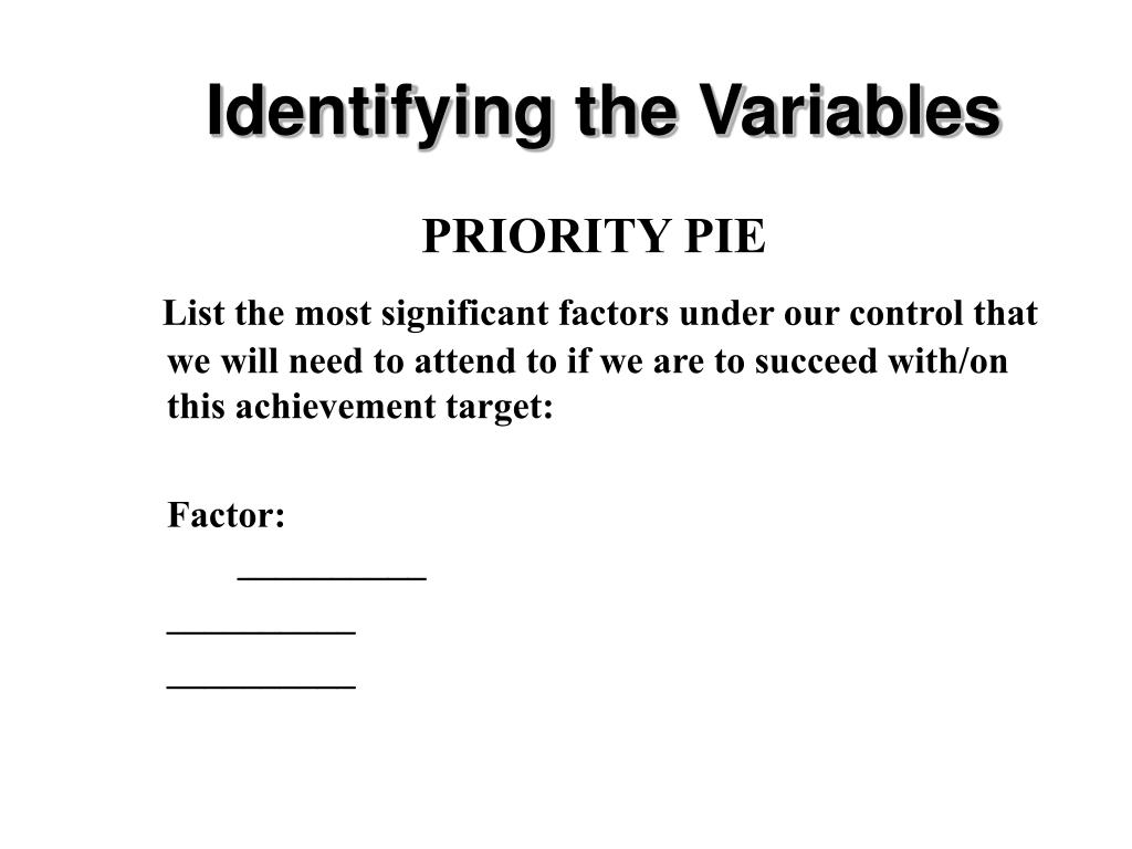 Identifying the Variables PRIORITY PIE List the most significant factors under our control that we will need to attend to if we are to succeed with/on this achievement target: Factor: __________ __________ __________