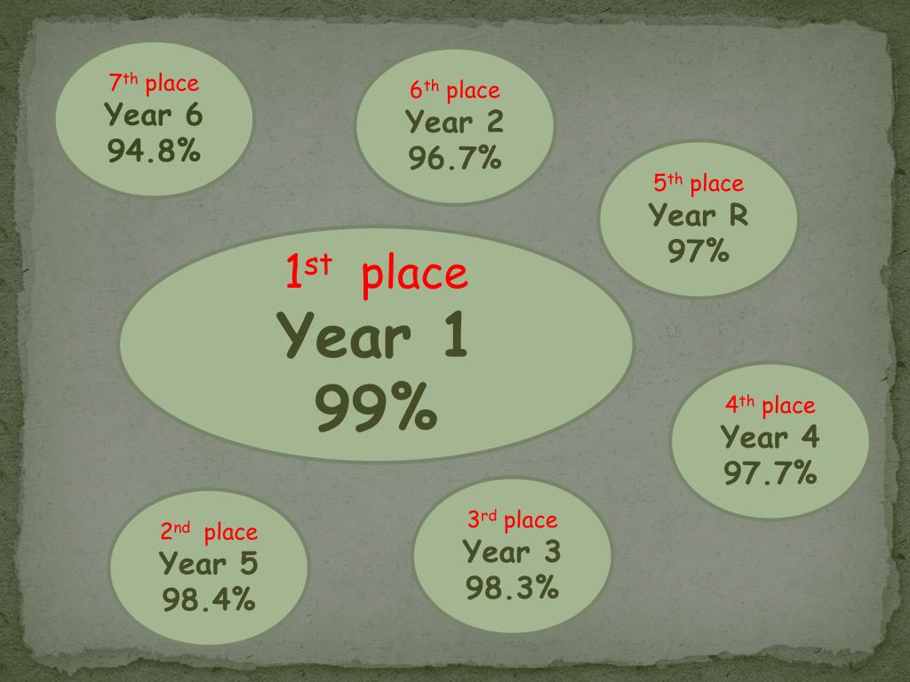7th place Year 6 94.8% 6th place Year 2 96.7% 5th place Year R 97% 1st place Year 1 99% 4th place Year 4 97.7% 3rd place Year 3 98.3% 2nd place Year 5 98.4%