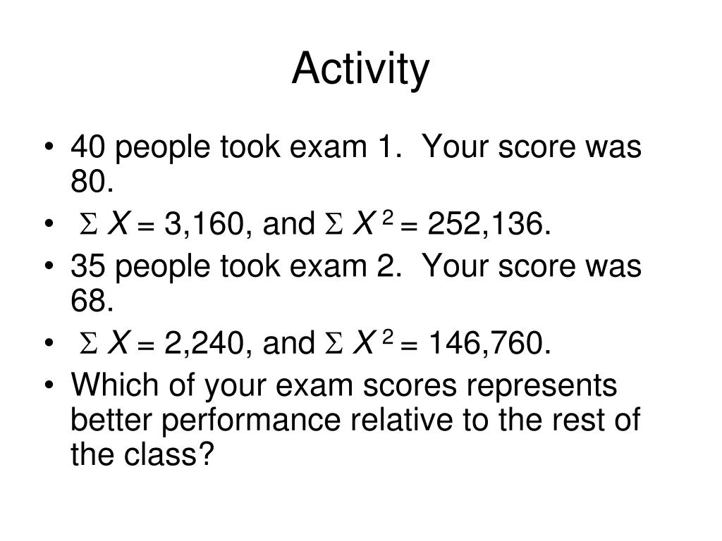 Activity • 40 people took exam 1. Your score was 80. • S X = 3,160, and S X2 = 252,136. • 35 people took exam 2. Your score was 68. • S X = 2,240, and S X2 = 146,760. • Which of your exam scores represents better performance relative to the rest of the class?