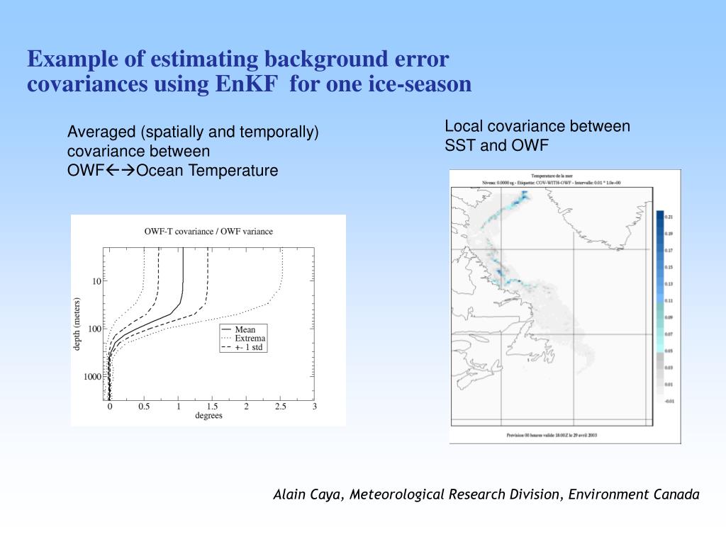 Local covariance betweenSST and OWF Averaged (spatially and temporally) covariance between OWFOcean Temperature Example of estimating background error covariances using EnKF for one ice-season Alain Caya, Meteorological Research Division, Environment Canada