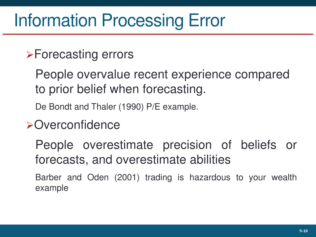 Information Processing Error • Forecasting errors People overvalue recent experience compared to prior belief when forecasting. De Bondt and Thaler (1990) P/E example. • Overconfidence People overestimate precision of beliefs or forecasts, and overestimate abilities Barber and Oden (2001) trading is hazardous to your wealth example