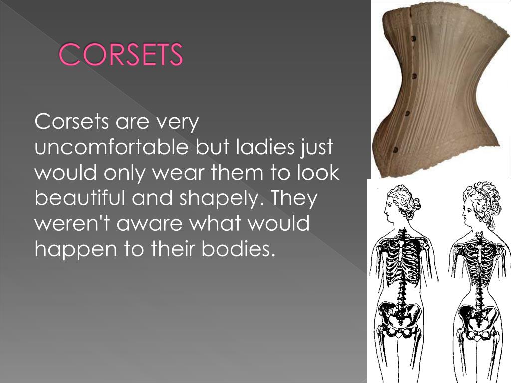 CORSETS Corsets are very uncomfortable but ladies just would only wear them to look beautiful and shapely. They weren't aware what would happen to their bodies.