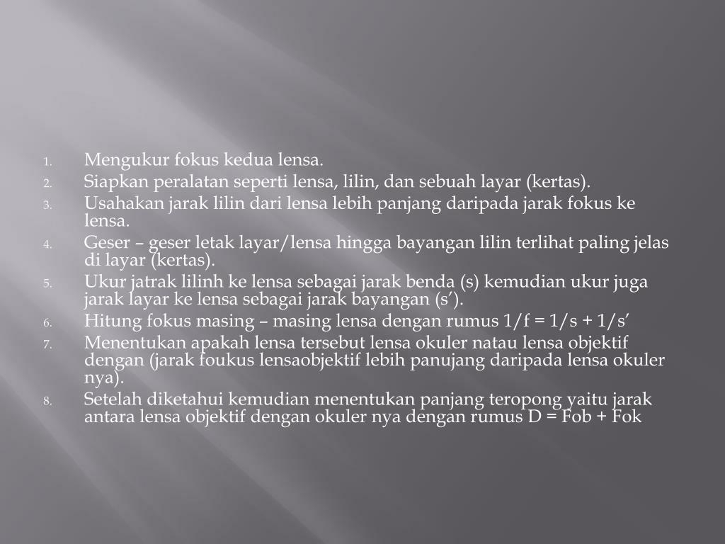 Mengukurfokuskedualensa. • Siapkanperalatansepertilensa, lilin, dansebuahlayar (kertas). • Usahakanjaraklilindarilensalebihpanjangdaripadajarakfokuskelensa. • Geser – geserletaklayar/lensahinggabayanganlilinterlihat paling jelasdilayar (kertas). • Ukurjatraklilinhkelensasebagaijarakbenda (s) kemudianukurjugajaraklayarkelensasebagaijarakbayangan (s’). • Hitungfokusmasing – masinglensadenganrumus 1/f = 1/s + 1/s’ • Menentukanapakahlensatersebutlensaokulernataulensaobjektifdengan (jarakfoukuslensaobjektiflebihpanujangdaripadalensaokulernya). • Setelahdiketahuikemudianmenentukanpanjangteropongyaitujarakantaralensaobjektifdenganokulernyadenganrumus D = Fob + Fok