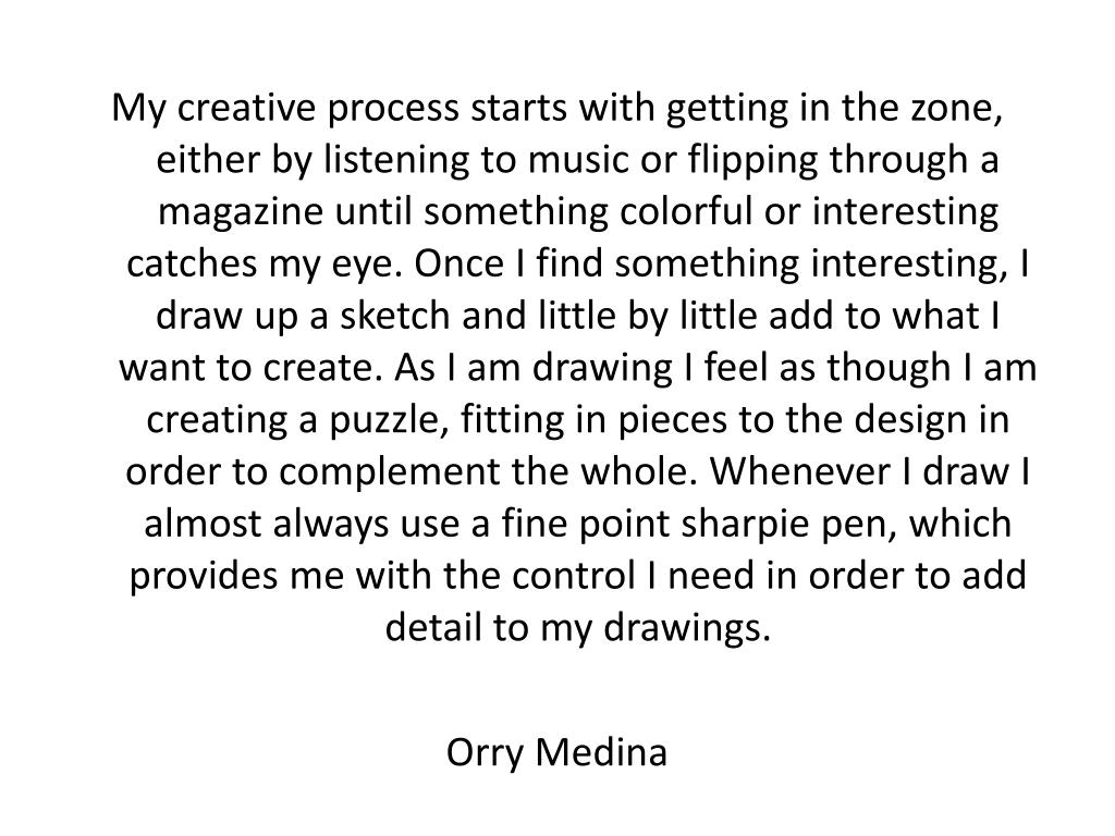 My creative process starts with getting in the zone, either by listening to music or flipping through a magazine until something colorful or interesting catches my eye. Once I find something interesting, I draw up a sketch and little by little add to what I want to create. As I am drawing I feel as though I am creating a puzzle, fitting in pieces to the design in order to complement the whole. Whenever I draw I almost always use a fine point sharpie pen, which provides me with the control I need in order to add detail to my drawings. Orry Medina