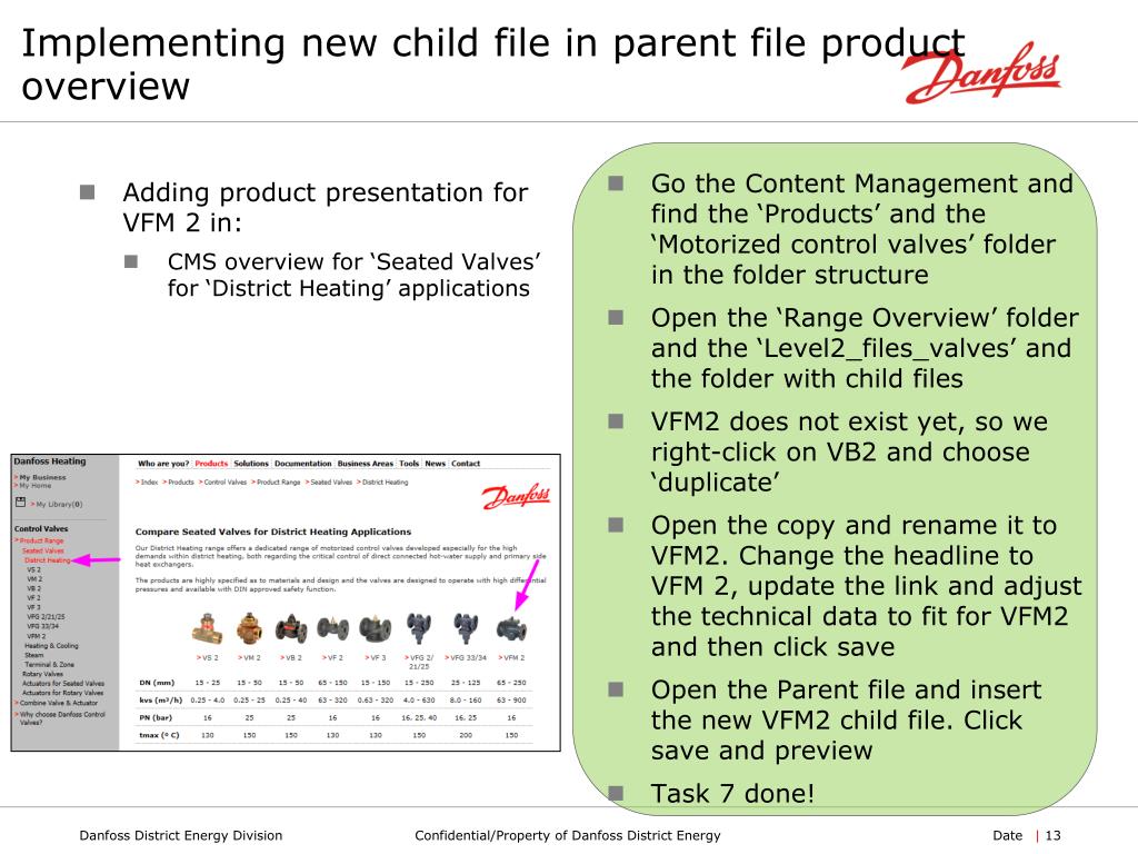 Implementing new child file in parent file productoverview • Go the Content Management and find the ‘Products’ and the ‘Motorizedcontrolvalves’ folder in the folder structure • Open the ‘Range Overview’ folder and the ‘Level2_files_valves’ and the folder with child files • VFM2 does not existyet, so we right-click on VB2 and choose ‘duplicate’ • Open the copy and rename it to VFM2. Change the headline to VFM 2, update the link and adjust the technical data to fit for VFM2 and thenclick save • Open the Parent file and insert the new VFM2 child file. Click save and preview • Task 7 done! • Addingproductpresentation for VFM 2 in: • CMS overview for ‘SeatedValves’ for ‘District Heating’ applications