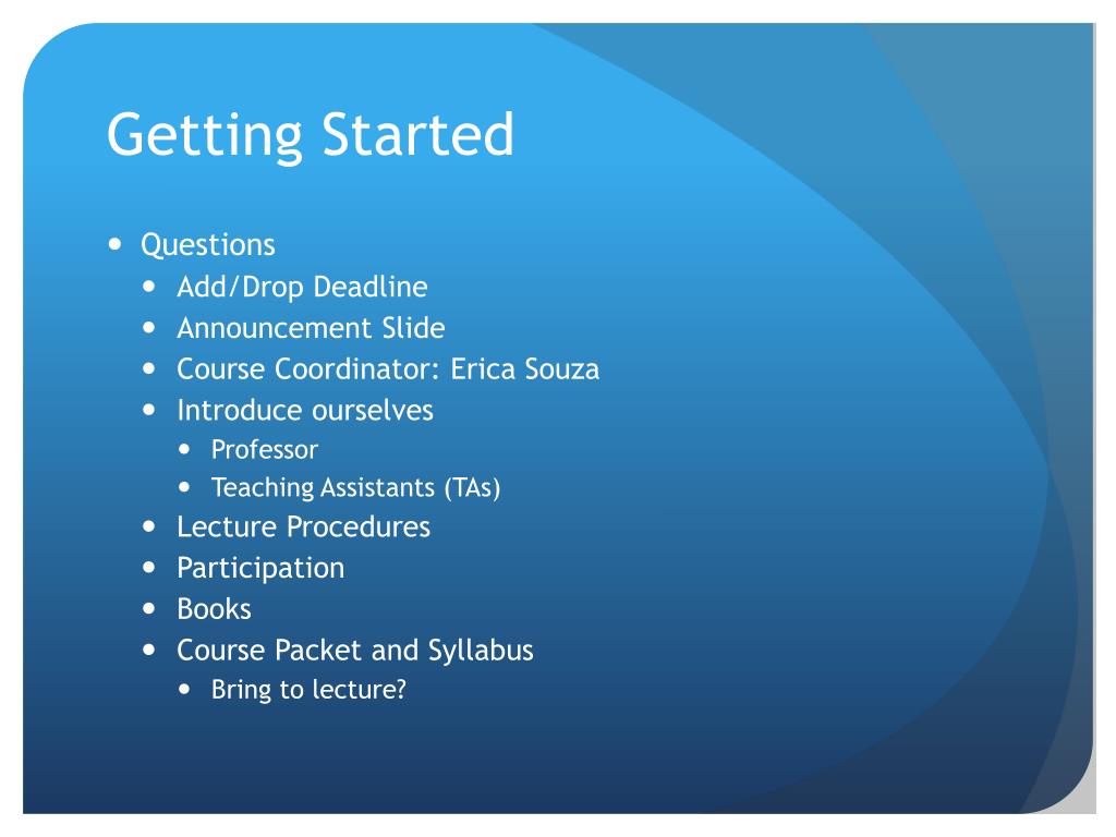 Getting Started • Questions • Add/Drop Deadline • Announcement Slide • Course Coordinator: Erica Souza • Introduce ourselves • Professor • Teaching Assistants (TAs) • Lecture Procedures • Participation • Books • Course Packet and Syllabus • Bring to lecture?