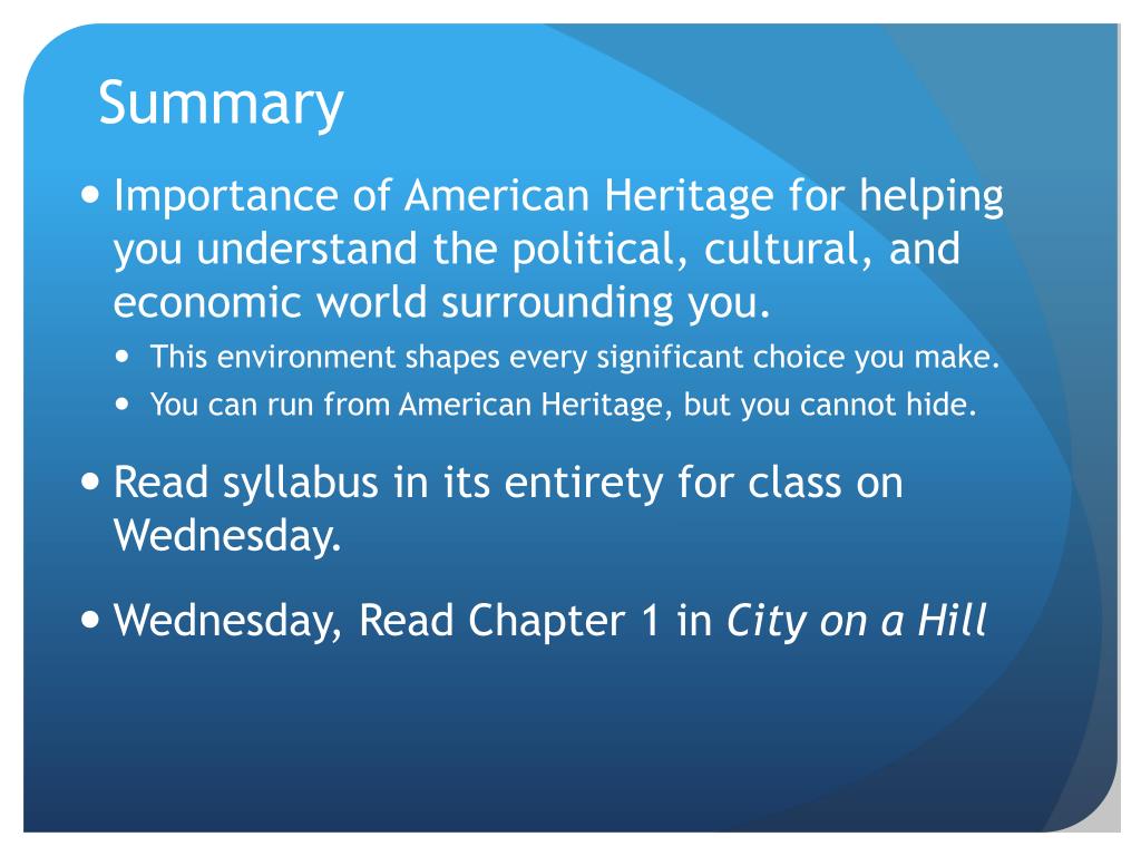 Summary • Importance of American Heritage for helping you understand the political, cultural, and economic world surrounding you. • This environment shapes every significant choice you make. • You can run from American Heritage, but you cannot hide. • Read syllabus in its entirety for class on Wednesday. • Wednesday, Read Chapter 1 in City on a Hill
