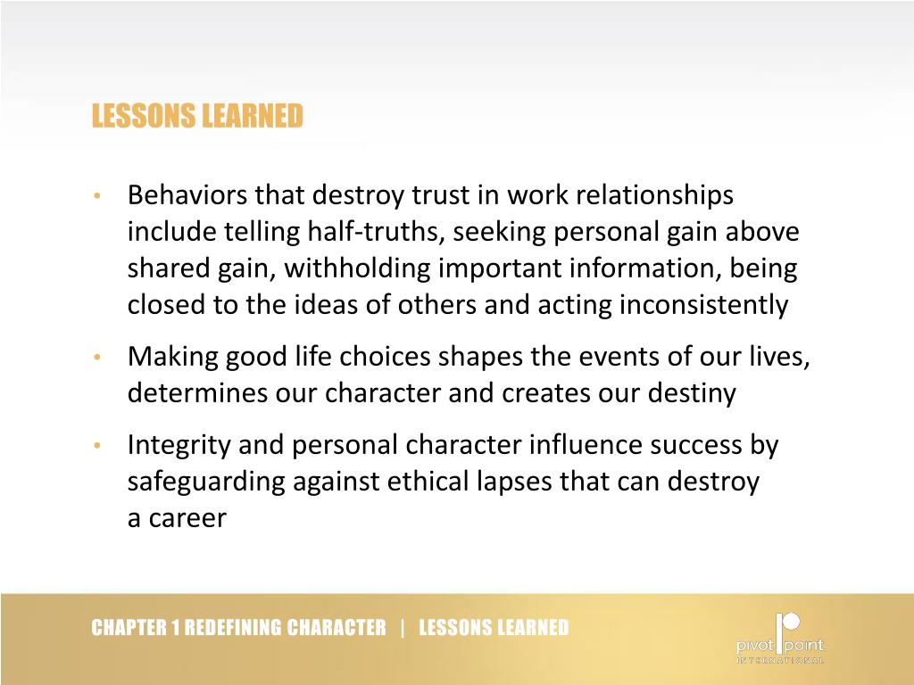 Lessons learned Behaviors that destroy trust in work relationships include telling half-truths, seeking personal gain above shared gain, withholding important information, being closed to the ideas of others and acting inconsistently Making good life choices shapes the events of our lives, determines our character and creates our destiny Integrity and personal character influence success by safeguarding against ethical lapses that can destroy a career Chapter 1 redefining character | lessons learned