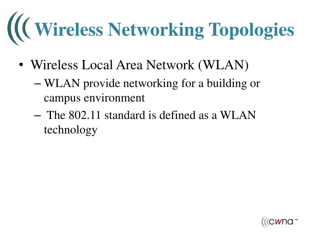 Wireless Networking Topologies • Wireless Local Area Network (WLAN) • WLAN provide networking for a building or campus environment • The 802.11 standard is defined as a WLAN technology
