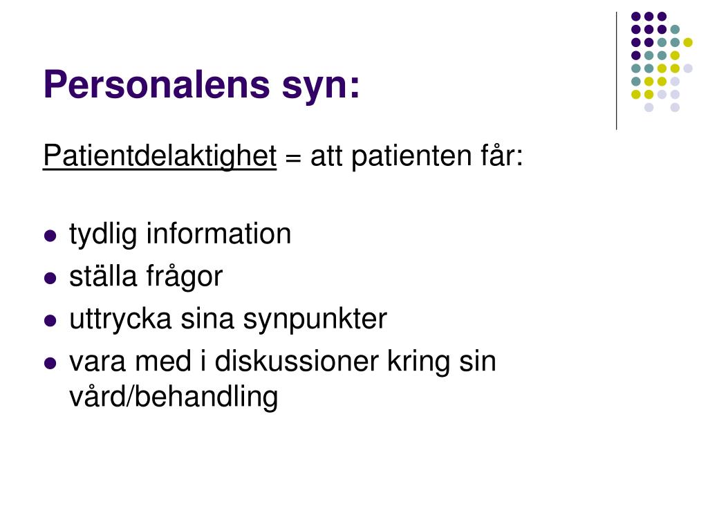 Personalens syn: Patientdelaktighet = att patienten får: • tydlig information • ställa frågor • uttrycka sina synpunkter • vara med i diskussioner kring sin vård/behandling