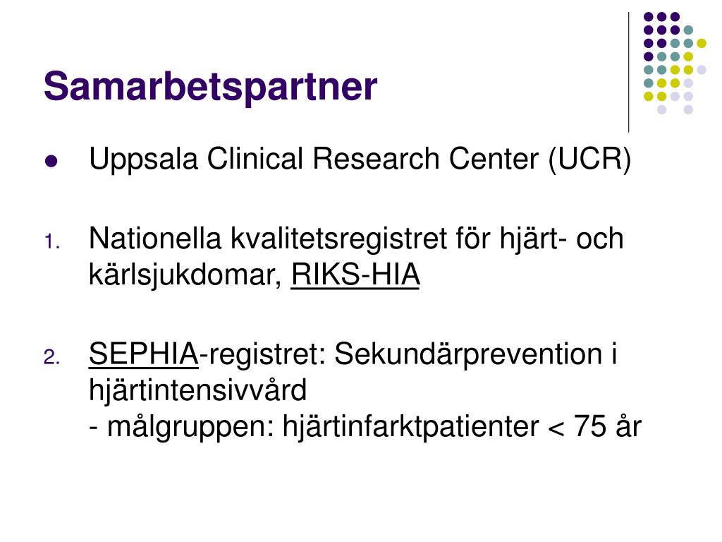 Samarbetspartner • Uppsala Clinical Research Center (UCR) • Nationella kvalitetsregistret för hjärt- och kärlsjukdomar, RIKS-HIA • SEPHIA-registret: Sekundärprevention i hjärtintensivvård- målgruppen: hjärtinfarktpatienter < 75 år