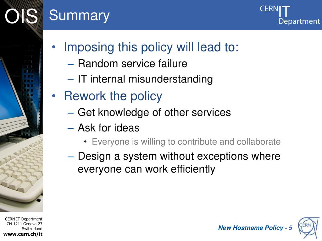 Summary • Imposing this policy will lead to: • Random service failure • IT internal misunderstanding • Rework the policy • Get knowledge of other services • Ask for ideas • Everyone is willing to contribute and collaborate • Design a system without exceptions where everyone can work efficiently New Hostname Policy - 5