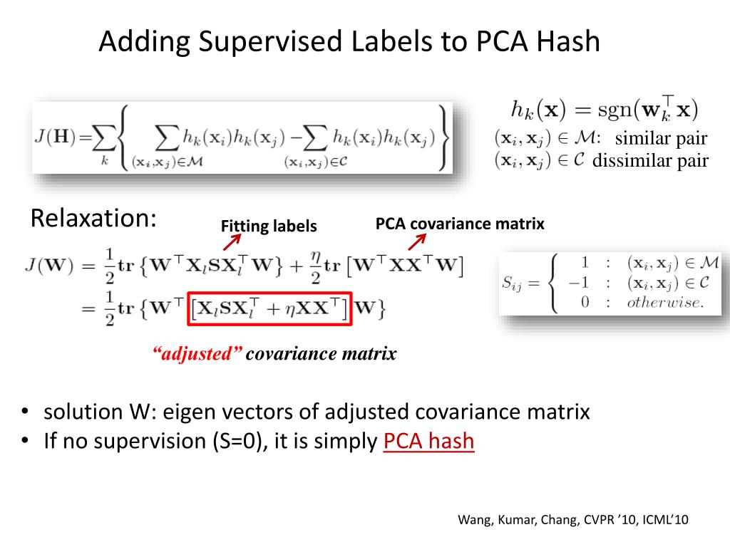 Adding Supervised Labels to PCA Hash similar pair dissimilar pair Relaxation: PCA covariance matrix Fitting labels “adjusted” covariance matrix • solution W: eigen vectors of adjusted covariance matrix • If no supervision (S=0), it is simply PCA hash Wang, Kumar, Chang, CVPR ’10, ICML’10