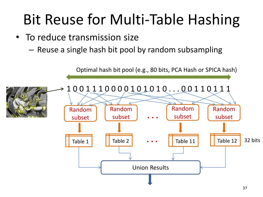 Bit Reuse for Multi-Table Hashing • To reduce transmission size • Reuse a single hash bit pool by random subsampling Optimal hash bit pool (e.g., 80 bits, PCA Hash or SPICA hash) 1 0 0 1 1 1 0 0 0 0 1 0 1 0 1 0 . . . 0 0 1 1 0 1 1 1 Random subset Random subset Random subset Random subset . . . . . . Table 12 Table 2 Table 11 Table 1 32 bits Union Results