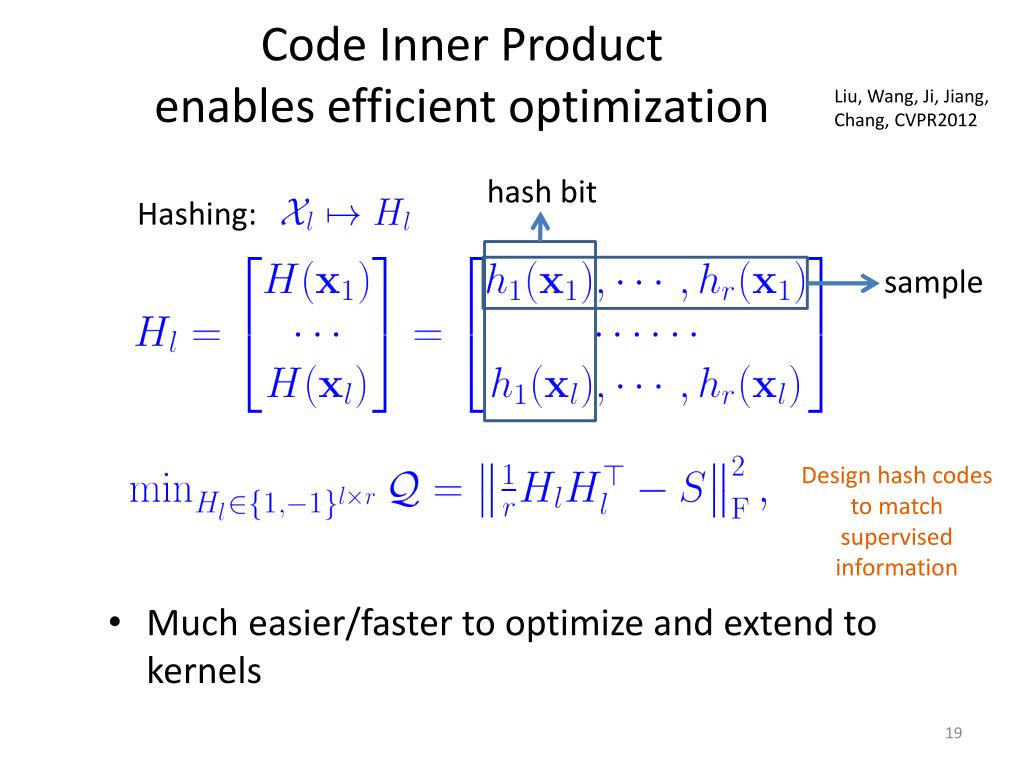 Code Inner Product enables efficient optimization Liu, Wang, Ji, Jiang, Chang, CVPR2012 hash bit • Much easier/faster to optimize and extend to kernels Hashing: sample Design hash codes to match supervised information