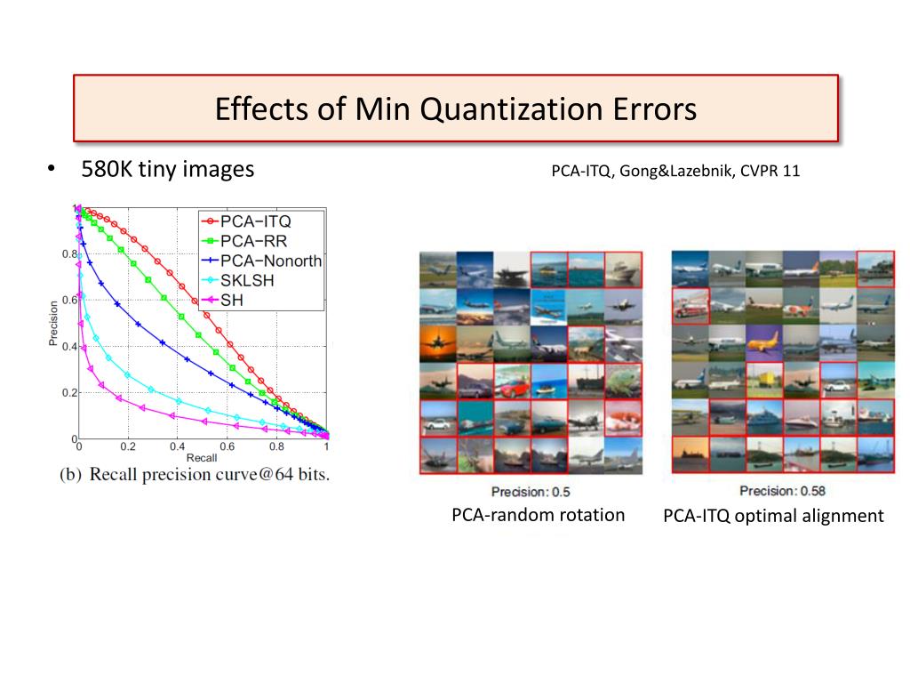 Effects of Min Quantization Errors • 580K tiny images PCA-ITQ, Gong&Lazebnik, CVPR 11 PCA-random rotation PCA-ITQ optimal alignment