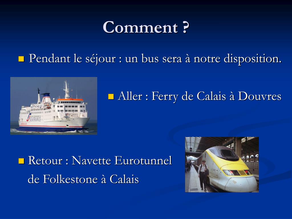 Comment ? • Pendant le séjour : un bus sera à notre disposition. • Aller : Ferry de Calais à Douvres • Retour : Navette Eurotunnel de Folkestone à Calais