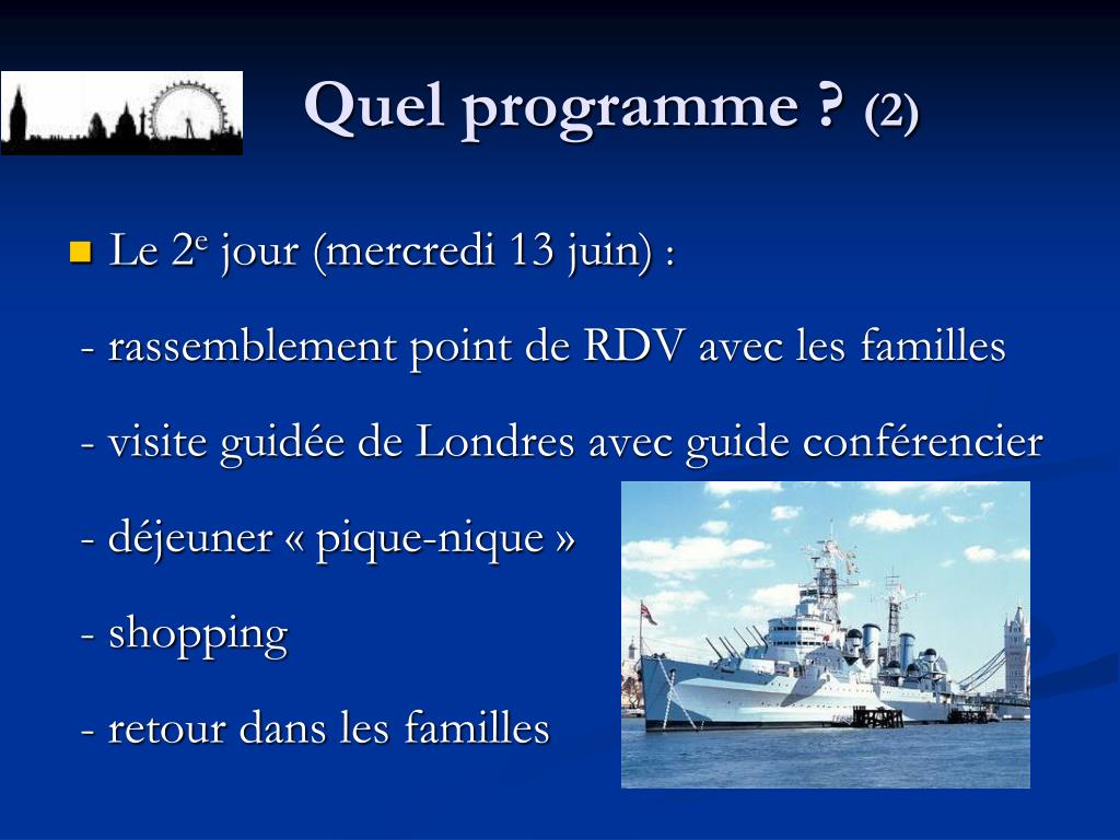 Quel programme ? (2) • Le 2e jour (mercredi 13 juin): - rassemblement point de RDV avec les familles - visite guidée de Londres avec guide conférencier - déjeuner « pique-nique » - shopping - retour dans les familles