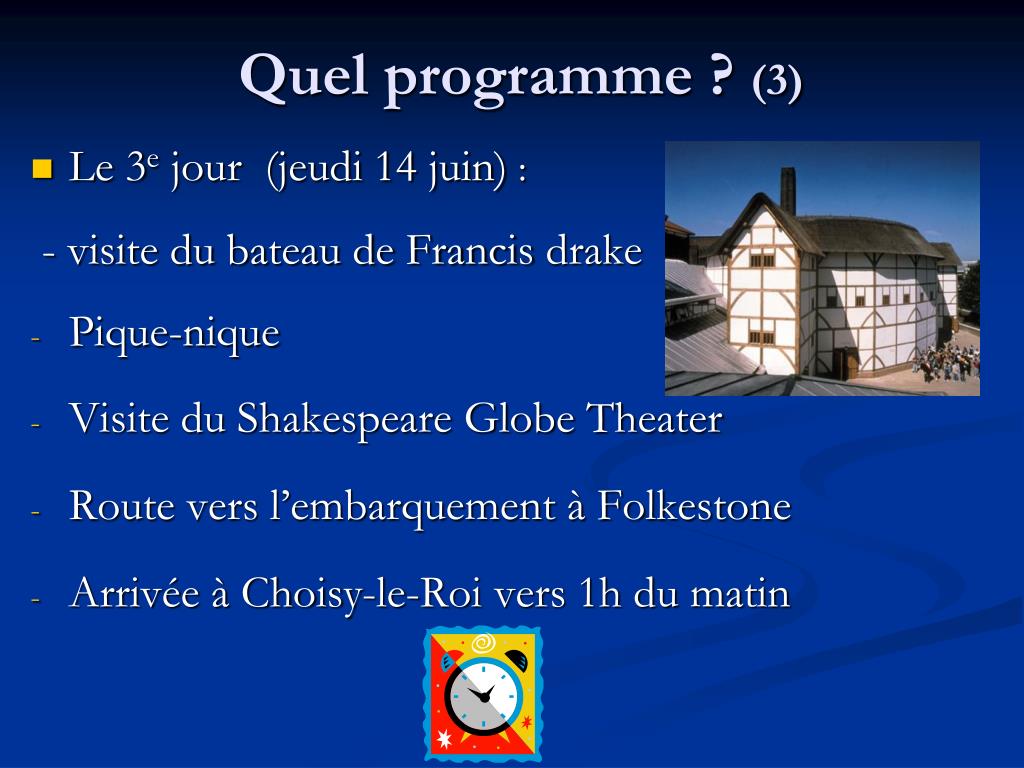 Quel programme ? (3) • Le 3e jour (jeudi 14 juin) : - visite du bateau de Francis drake • Pique-nique • Visite du Shakespeare Globe Theater • Route vers l’embarquement à Folkestone • Arrivée à Choisy-le-Roi vers 1h du matin