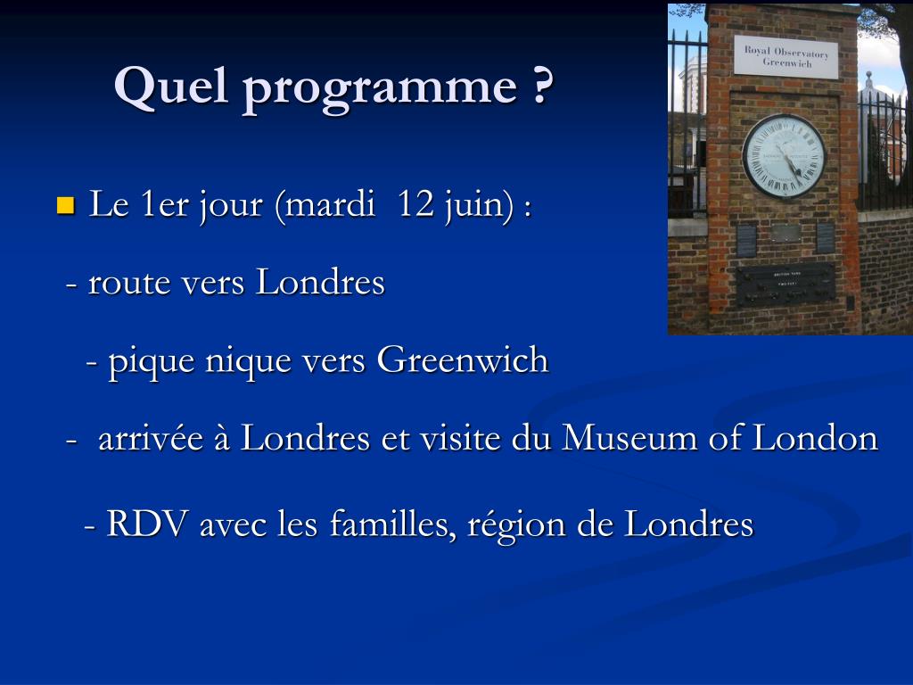 Quel programme ? • Le 1er jour (mardi 12 juin) : - route vers Londres - pique nique vers Greenwich - arrivée à Londres et visite du Museum of London - RDV avec les familles, région de Londres