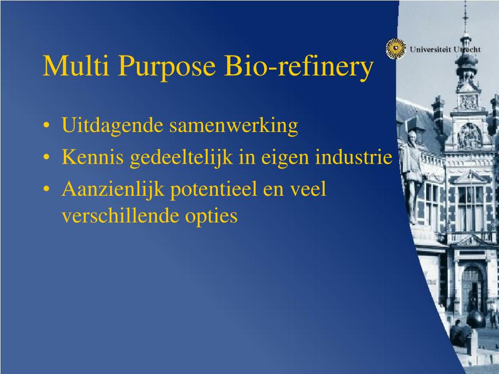 Multi Purpose Bio-refinery • Uitdagende samenwerking • Kennis gedeeltelijk in eigen industrie • Aanzienlijk potentieel en veel verschillende opties
