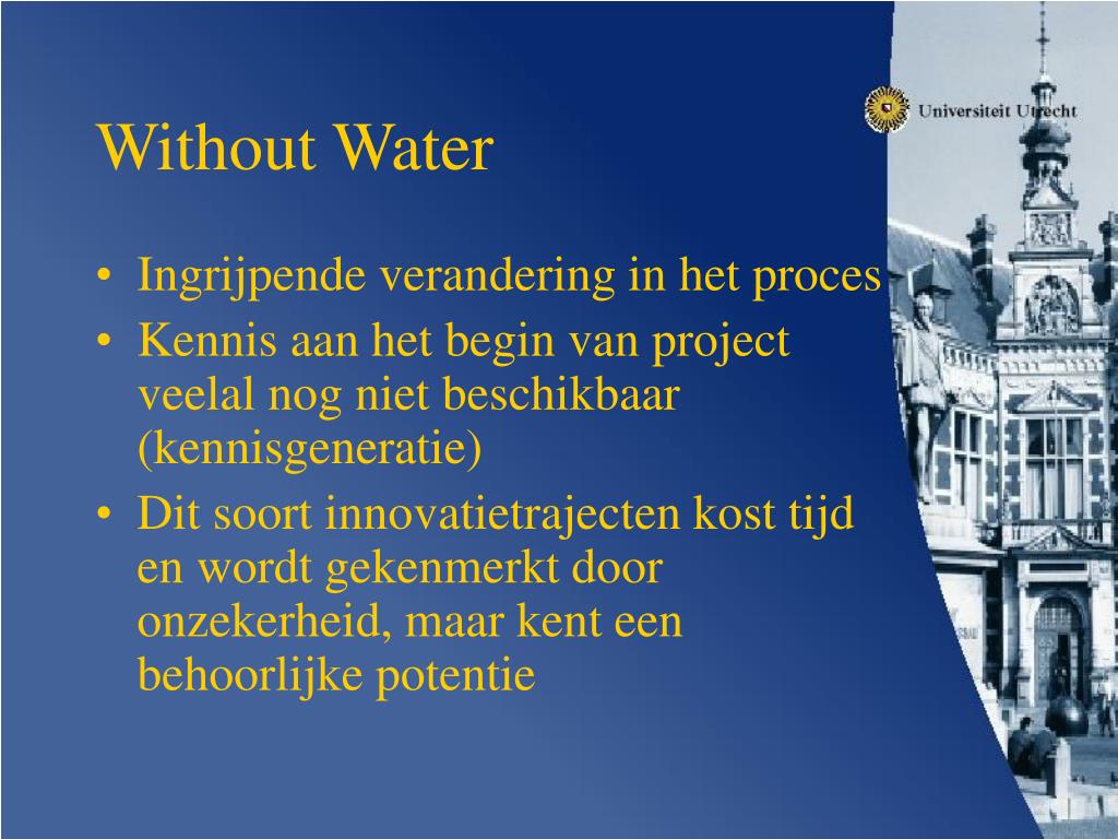 Without Water • Ingrijpende verandering in het proces • Kennis aan het begin van project veelal nog niet beschikbaar (kennisgeneratie) • Dit soort innovatietrajecten kost tijd en wordt gekenmerkt door onzekerheid, maar kent een behoorlijke potentie