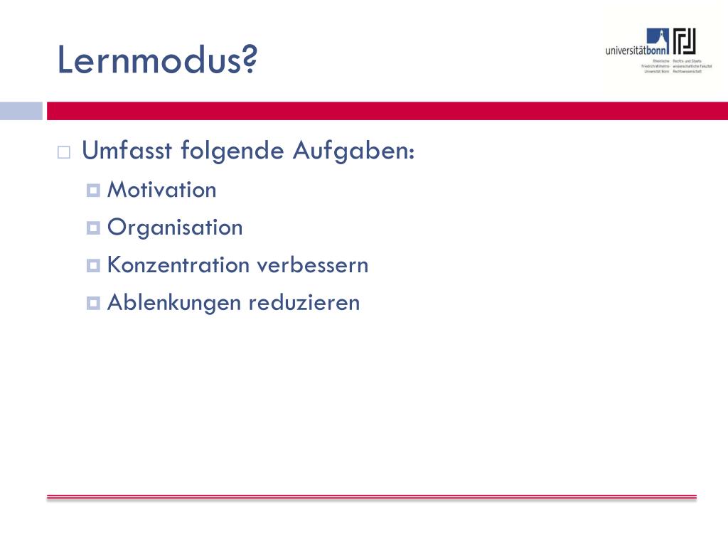 Lernmodus? • Umfasst folgende Aufgaben: • Motivation • Organisation • Konzentration verbessern • Ablenkungen reduzieren