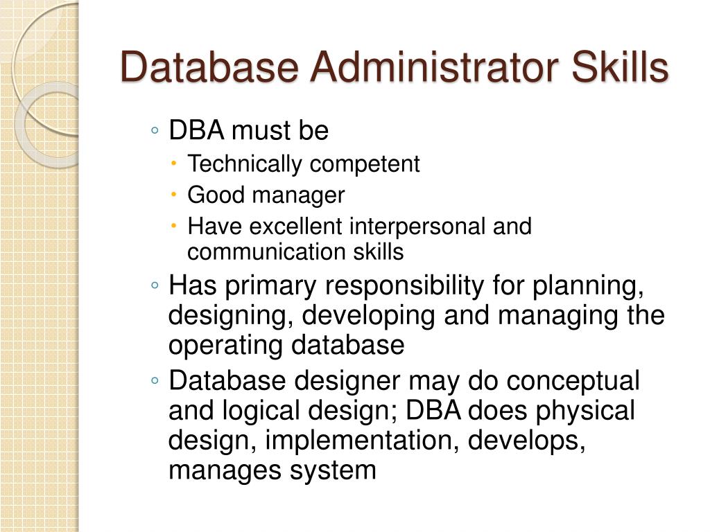 Database Administrator Skills • DBA must be • Technically competent • Good manager • Have excellent interpersonal and communication skills • Has primary responsibility for planning, designing, developing and managing the operating database • Database designer may do conceptual and logical design; DBA does physical design, implementation, develops, manages system