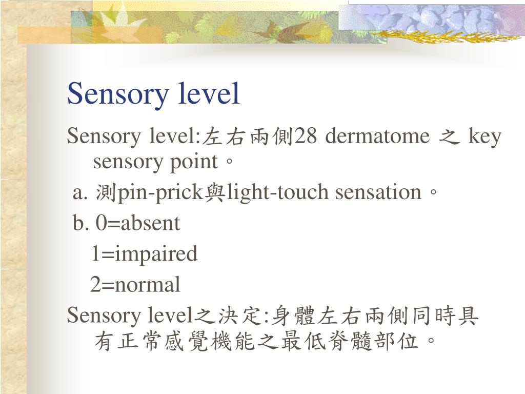 Sensory level Sensory level:左右兩側28 dermatome 之key sensory point。 a. 測pin-prick與light-touch sensation。 b.0=absent 1=impaired 2=normal Sensory level之決定:身體左右兩側同時具有正常感覺機能之最低脊髓部位。