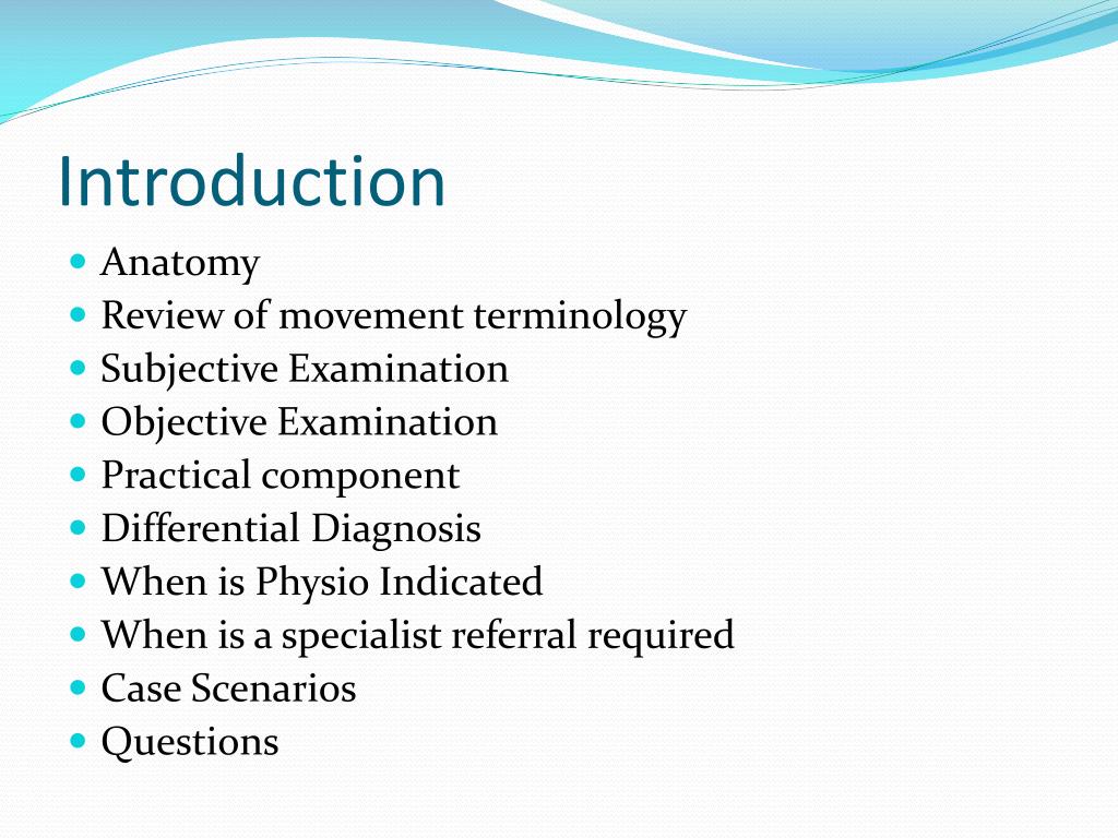 Introduction • Anatomy • Review of movement terminology • Subjective Examination • Objective Examination • Practical component • Differential Diagnosis • When is Physio Indicated • When is a specialist referral required • Case Scenarios • Questions