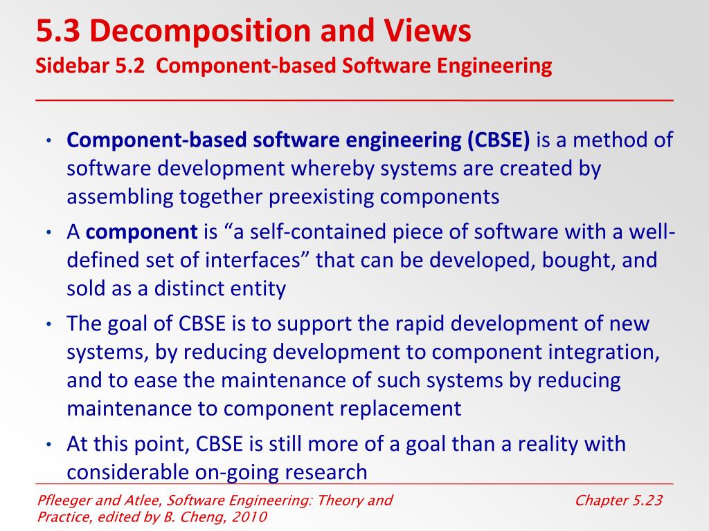 5.3 Decomposition and ViewsSidebar 5.2 Component-based Software Engineering Component-based software engineering (CBSE) is a method of software development whereby systems are created by assembling together preexisting components A component is “a self-contained piece of software with a well-defined set of interfaces” that can be developed, bought, and sold as a distinct entity The goal of CBSE is to support the rapid development of new systems, by reducing development to component integration, and to ease the maintenance of such systems by reducing maintenance to component replacement At this point, CBSE is still more of a goal than a reality with considerable on-going research