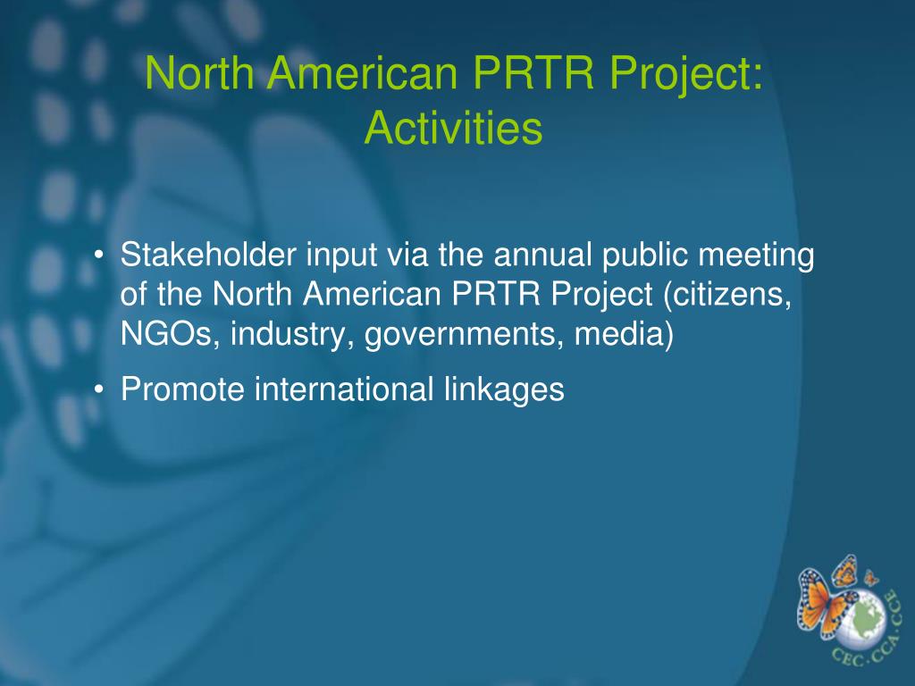 Stakeholder input via the annual public meeting of the North American PRTR Project (citizens, NGOs, industry, governments, media) Promote international linkages North American PRTR Project: Activities