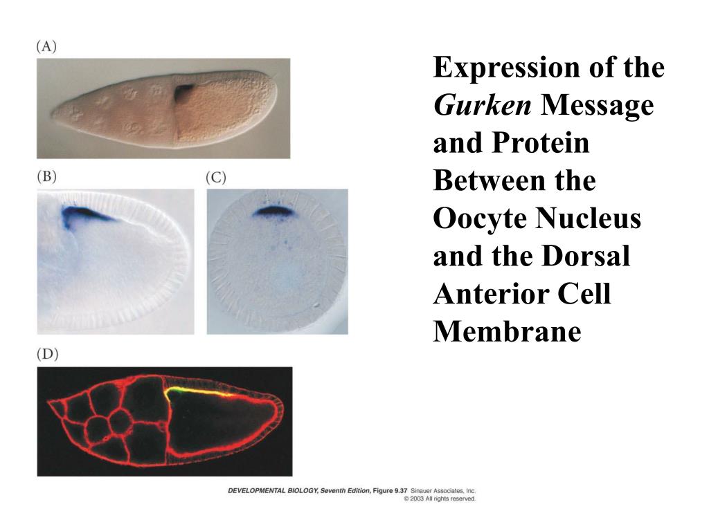 Gurken protein specifies the Anterior-Posterior axis of the Drosophila embryo during oogenesis (Similar to EGF)