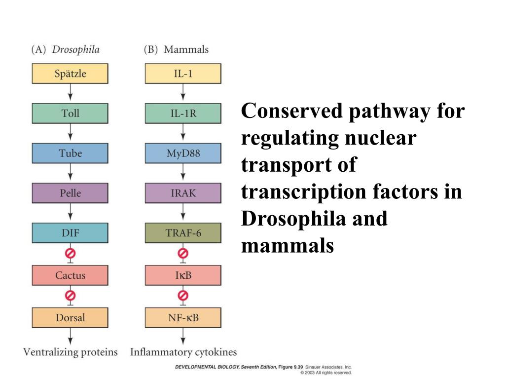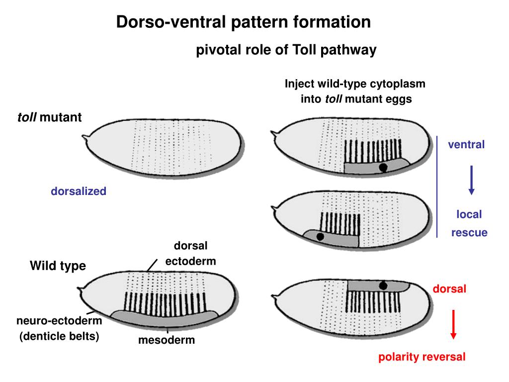Dorso-ventral pattern formation pivotal role of Toll pathway Inject wild-type cytoplasm into toll mutant eggs toll mutant ventral dorsalized local rescue dorsal ectoderm Wild type dorsal neuro-ectoderm (denticle belts) mesoderm polarity reversal