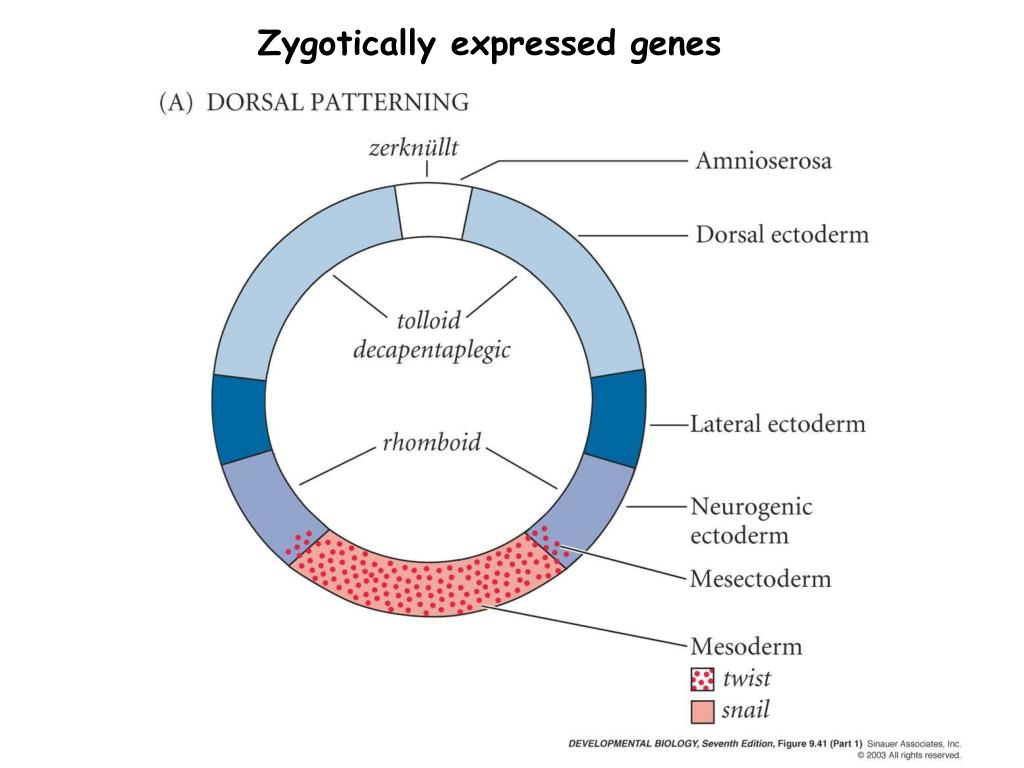 Maternal-effect mutations Genes expressed during oogenesis (= before fertilization) or genes expressed in maternal cells (follicle) All progeny of heterozygous mother are normal. All progeny are affected only if mother is homozygous mutant Zygotic mutations Genes expressed during embryogenesis (= after fertilization) Only genetically mutant embryos are affected. (25% of progeny of heterozygous mother are affected.)