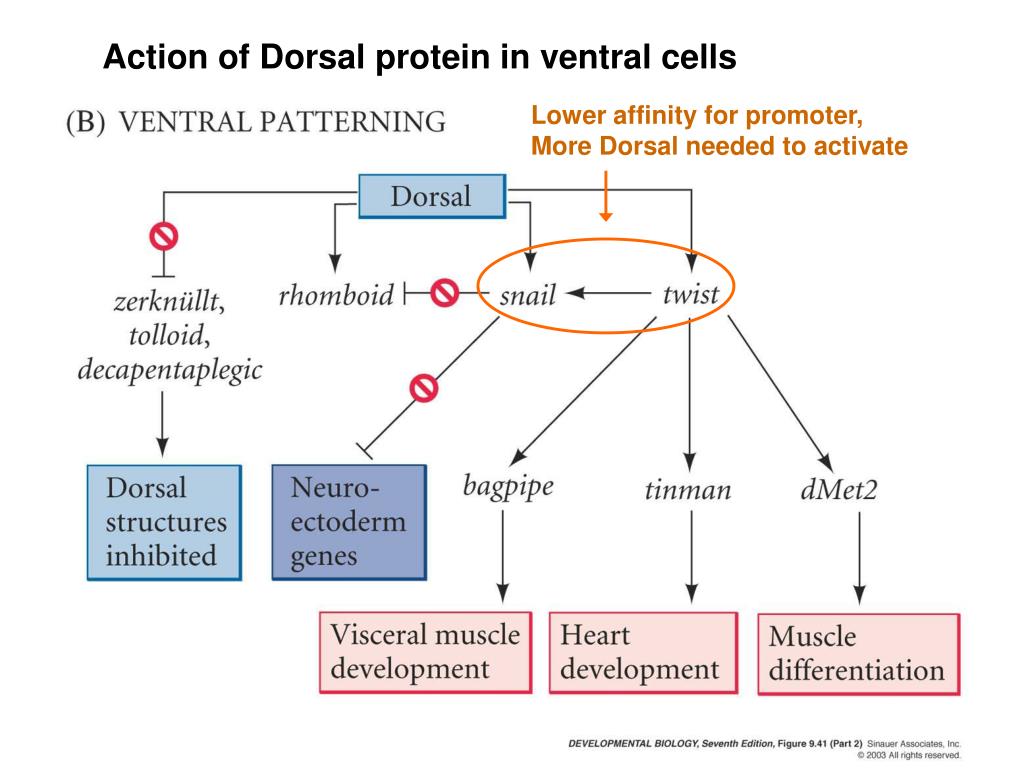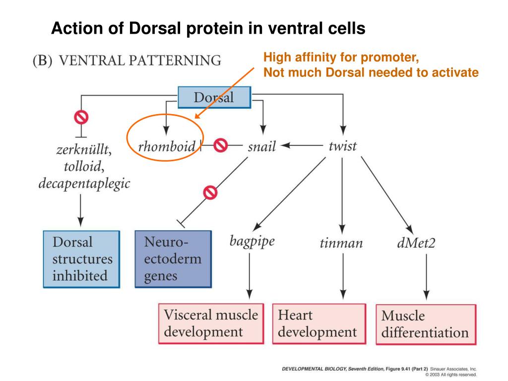 Action of Dorsal protein in ventral cells Lower affinity for promoter, More Dorsal needed to activate