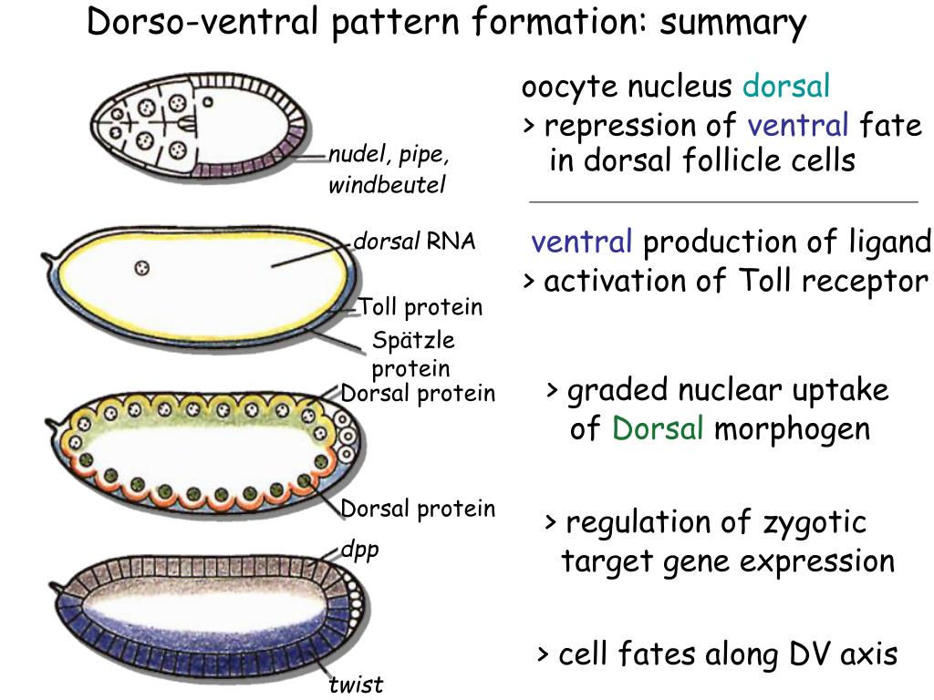 Dorso-ventral pattern formation: summary nudel, pipe, windbeutel dorsal RNA Toll protein Spätzle protein Dorsal protein Dorsal protein dpp twist oocyte nucleus dorsal > repression of ventral fate in dorsal follicle cells ventral production of ligand > activation of Toll receptor > graded nuclear uptake of Dorsal morphogen > regulation of zygotic target gene expression > cell fates along DV axis