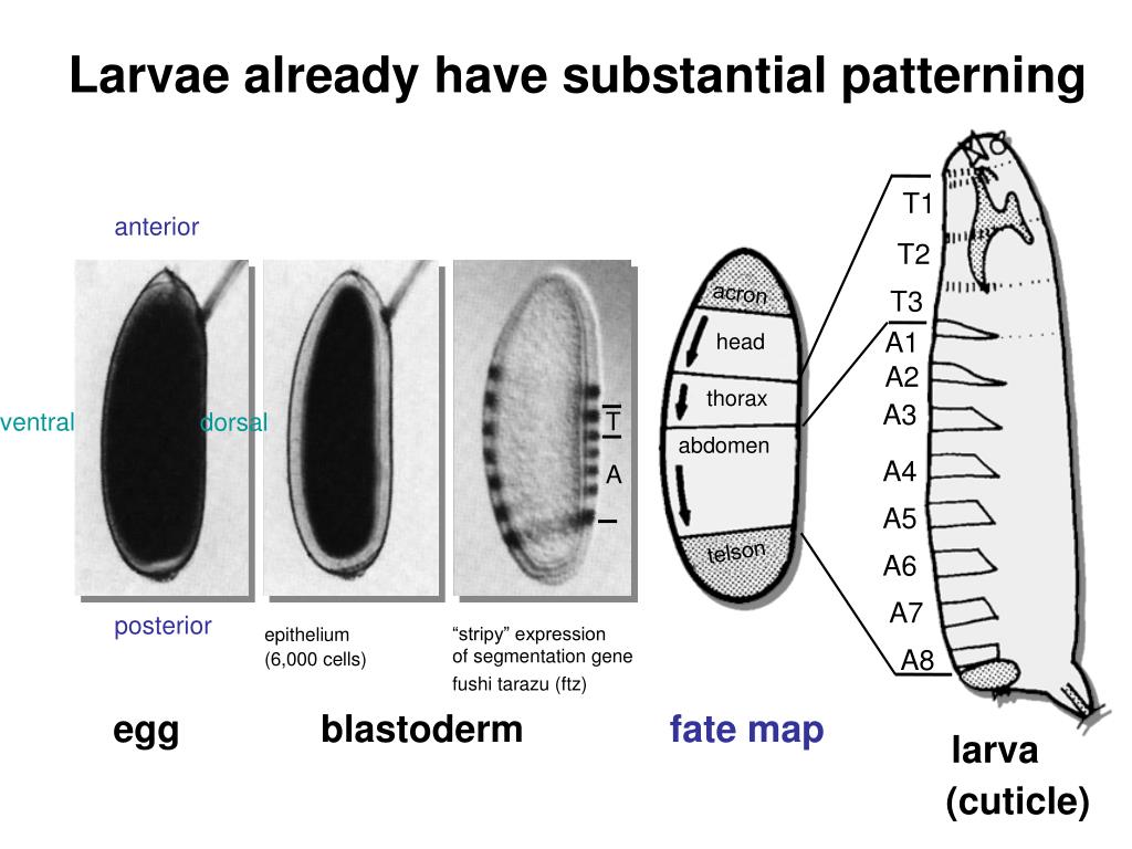 T1 T2 acron T3 head A1 A2 thorax A3 abdomen A4 A5 telson A6 A7 A8 Larvae already have substantial patterning anterior T ventral dorsal A posterior “stripy” expression epithelium of segmentation gene (6,000 cells) fushi tarazu (ftz) egg blastoderm fate map larva (cuticle)