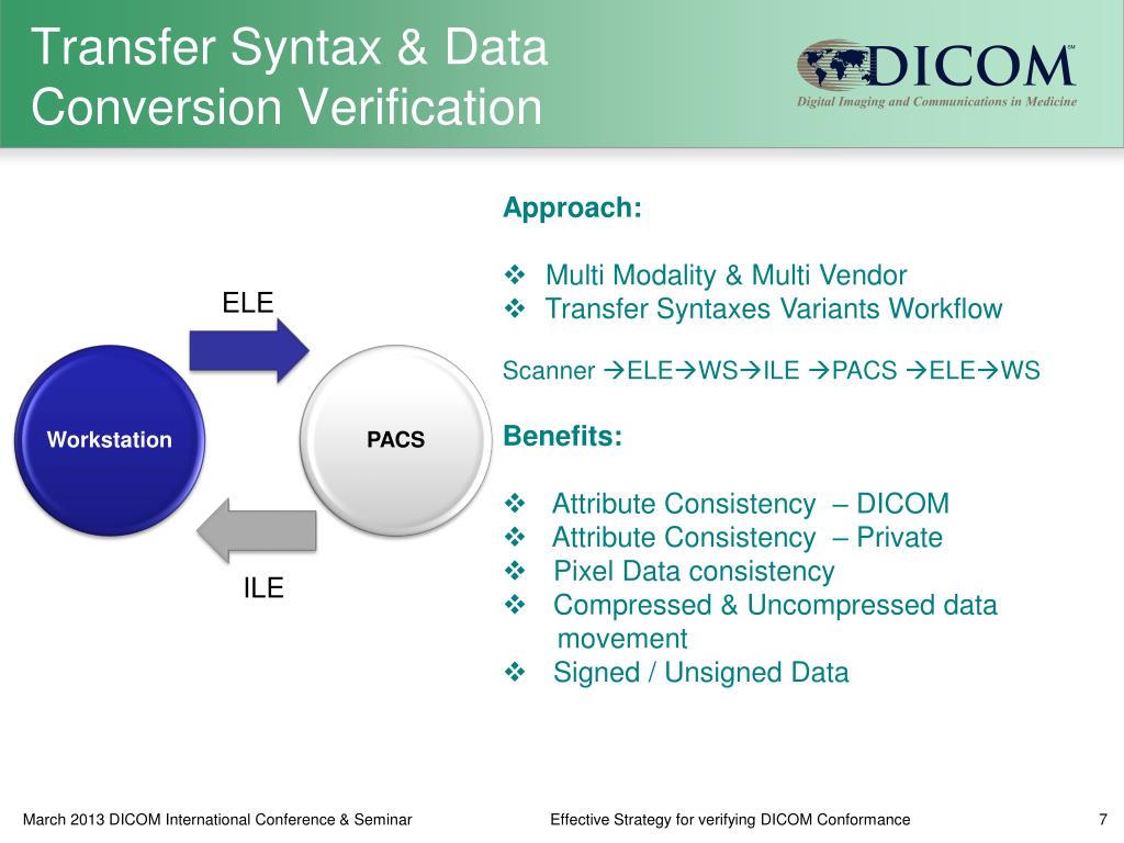 TransferSyntax & Data Conversion Verification • Approach: • Multi Modality & Multi Vendor • Transfer Syntaxes Variants Workflow • Scanner ELEWSILE PACS ELEWS • Benefits: • Attribute Consistency – DICOM • Attribute Consistency – Private • Pixel Data consistency • Compressed & Uncompressed data • movement • Signed / Unsigned Data ELE ILE Effective Strategy for verifying DICOM Conformance
