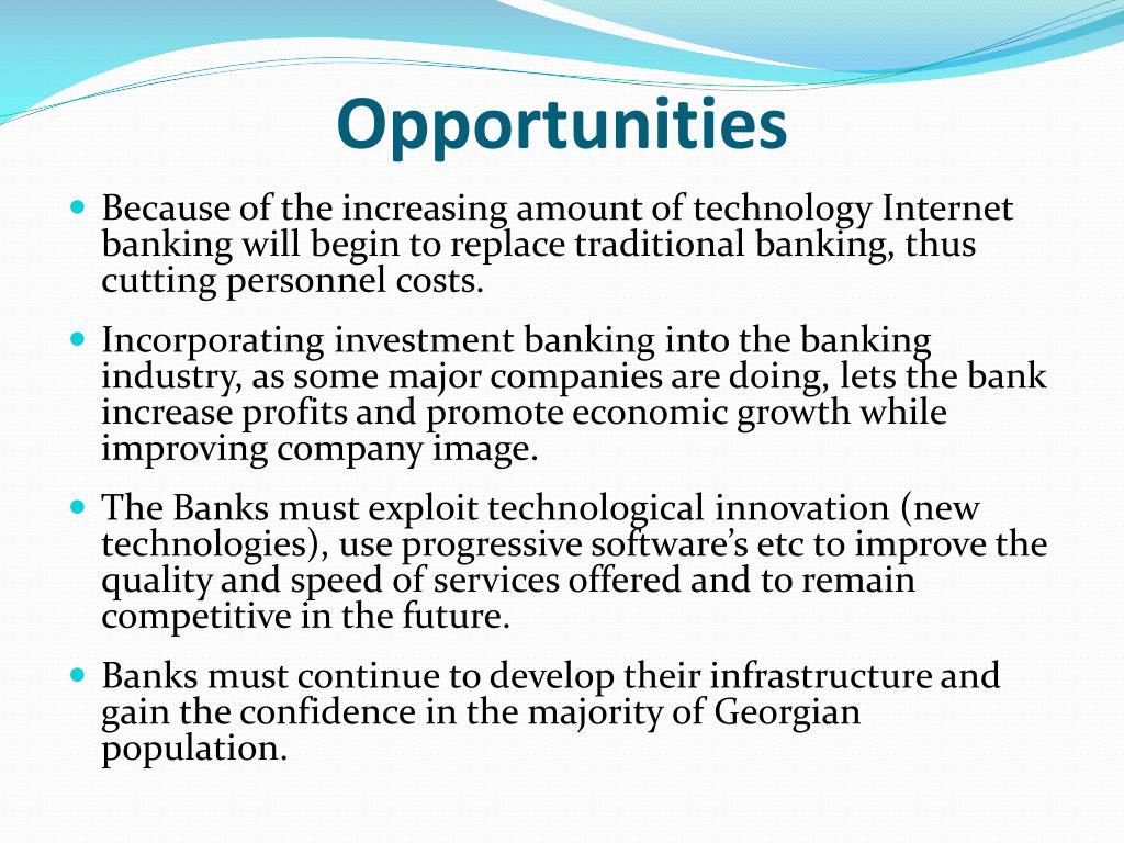 Opportunities • Because of the increasing amount of technology Internet banking will begin to replace traditional banking, thus cutting personnel costs. • Incorporating investment banking into the banking industry, as some major companies are doing, lets the bank increase profits and promote economic growth while improving company image. • The Banks must exploit technological innovation (new technologies), use progressive software’s etc to improve the quality and speed of services offered and to remain competitive in the future. • Banks must continue to develop their infrastructure and gain the confidence in the majority of Georgian population.