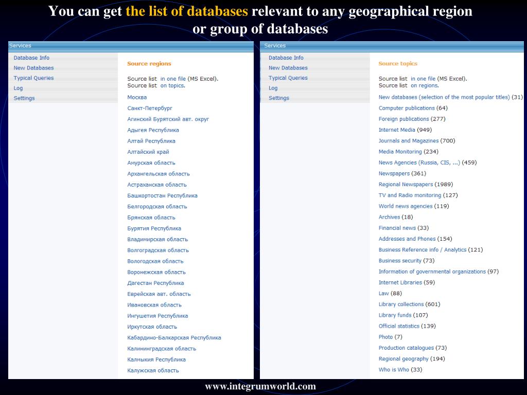 the largest online information service in Russia and the CIS INTEGRUM www.integrumworld.com