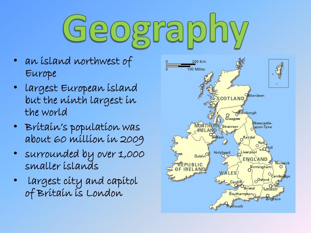 Geography • an island northwest of Europe • largest European island but the ninth largest in the world • Britain’s population was about 60 million in 2009 • surrounded by over 1,000 smaller islands • largest city and capitol of Britain is London