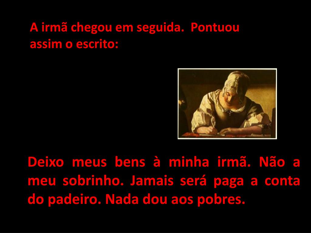 O sobrinho fez a seguinte pontuação: Deixo meus bens à minha irmã? Não! A meu sobrinho. Jamais será paga a conta do padeiro. Nada dou aos pobres.
