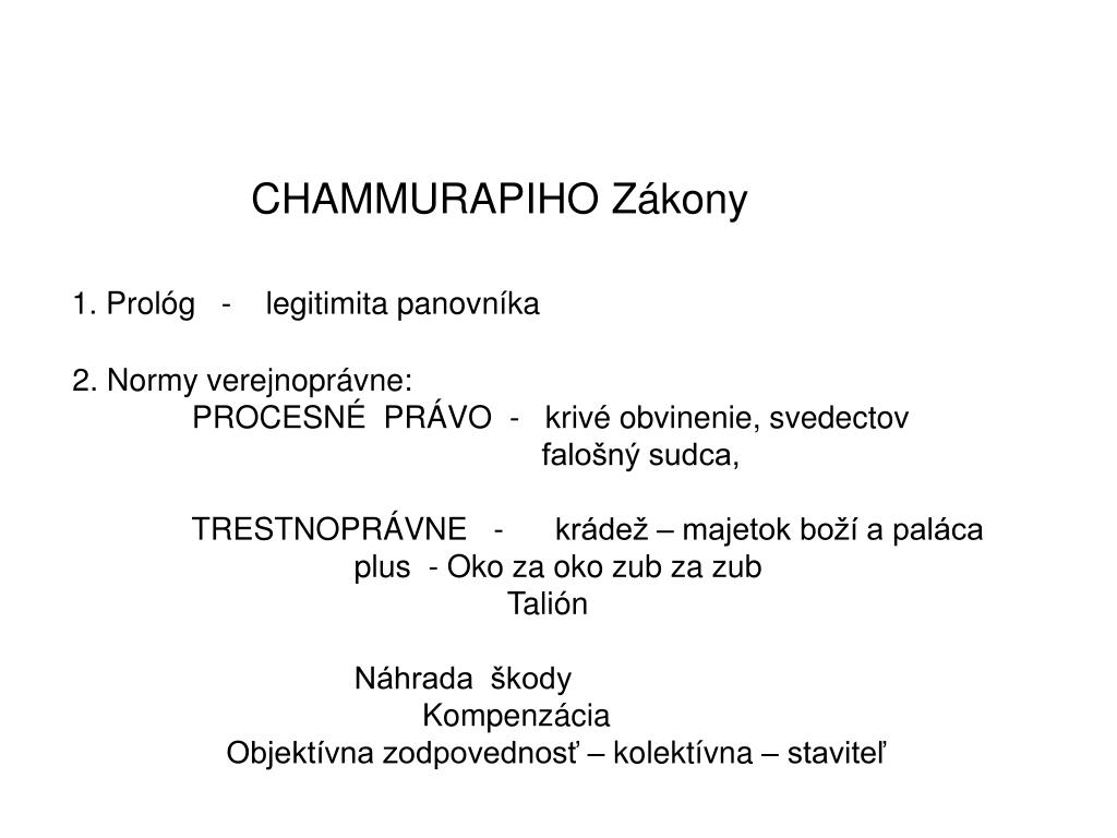 CHAMMURAPIHO Zákony 1. Prológ - legitimita panovníka 2. Normy verejnoprávne: PROCESNÉ PRÁVO - krivé obvinenie, svedectov falošný sudca, TRESTNOPRÁVNE - krádež – majetok boží a paláca plus - Oko za oko zub za zub Talión Náhrada škody Kompenzácia Objektívna zodpovednosť – kolektívna – staviteľ