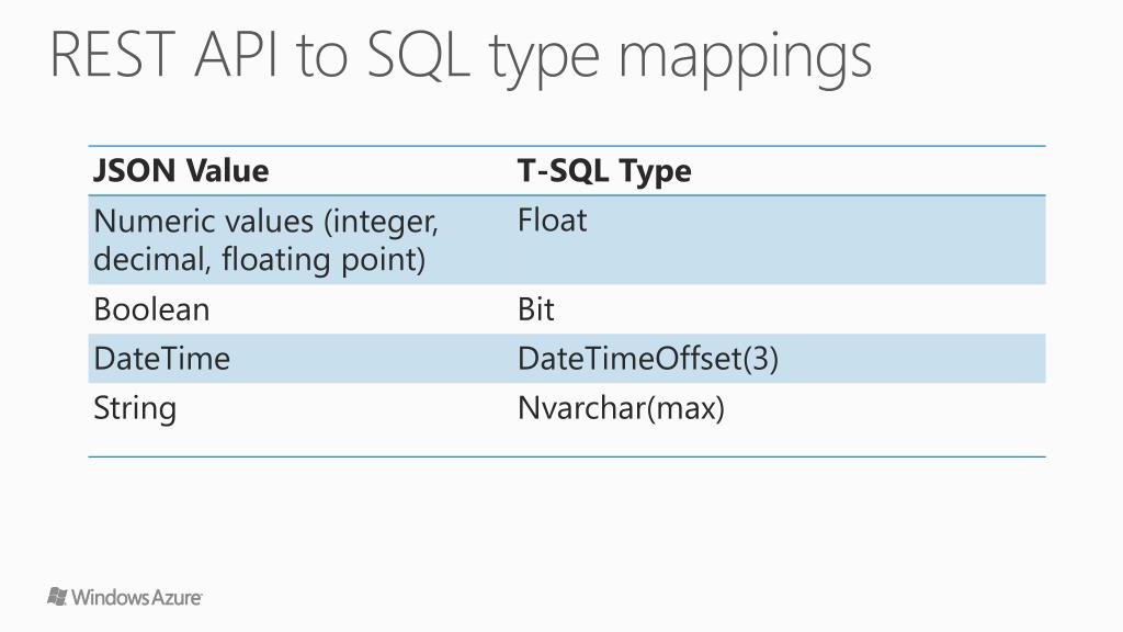 Pricing Example: $5/ Month Unlimited ingress = <165MB daily egress 100MB SQL Database 10 x Mobile Services on shared instances • How? • 10 FREE mobile services on shared instance • Includes 165MB/day of FREE egress from API calls • Cost - All services sharing a 100MB DB is $5 USD / Month • Use Pricing Calculator to Estimate your costs Note: Free Egress is per subscription, not per mobile service
